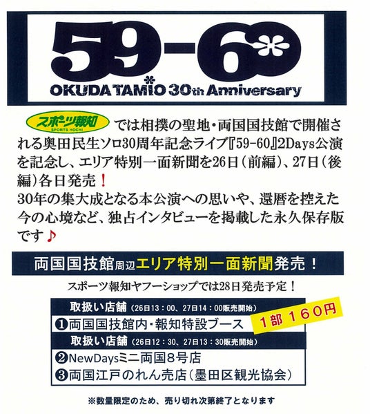 スポーツ報知を発行する報知新聞社(代表取締役社長・依田裕彦)は10月26、27日に両国国技館で開催される奥田民生ソロ30周年記念ライブ「59ー60」2Days公演を記念し、エリア特別1面新聞を発売します。30年の集大成となる本公演への思いや心境などを語った独占インタビューを収録。26日に前編、27日に後編の掲載になります。