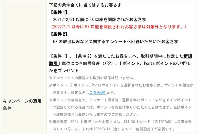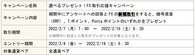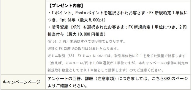 株式会社SBI証券(本社:東京都港区、代表取締役社長:高村正人、以下「当社」)は、SBI FXα(外国為替保証金取引)において、2022年2月7日(月)から12日間限定で、「選べるプレゼント!FX取引応援キャンペーン」を実施します。本キャンペーンでは、ご希望のプレゼントを暗号資産(XRP)、もしくはポイント(Tポイント、Pontaポイント)から選択のうえアンケートへご回答いただき、FXの新規取引をしたお客さまに、暗号資産(XRP)、Tポイント、Pontaポイントのいずれかをプレゼントします。