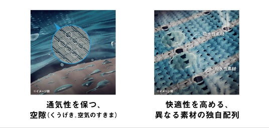『ドライエアロフロー』は、水の保水量を抑える「疎水・撥水糸」と水を吸い込む「吸水糸」を組み合わせた構造により、汗の膜ができにくく、通気性を保つ生地設計にしています。そのため、汗が気化する時に、体から熱を奪う作用によって放熱性を高め、クーリング機能を発揮するミズノ独自開発の素材です。