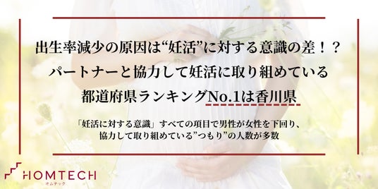 「パートナーと協力して妊活に取り組めていると思いますか」という調査結果をさらに分析した結果、「取り組めている・まあ取り組めている」と回答した割合が一番高い都道府県は香川県でした。2位が徳島県、3位が高知県であり、四国地方が上位を独占する結果となっています。1位の香川県では「将来の子供希望で子供を欲しいと思っていない」と答えた割合が47都道府県で46位と、いつかは子どもがほしいと考える人が多く、「男性不妊」への罹患不安を持つ男性の割合が47都道府県で最も多いという結果から、男性側の妊活に対する意識が高いことが考えられます。現在の日本では男性不妊・男性側の妊活への意識はまだまだ低く、妊活を自分ゴト化できていない男性側のリテラシー向上が不可欠であり、「妊活を女性だけのものにしない」という精神が大切だと考えられます。