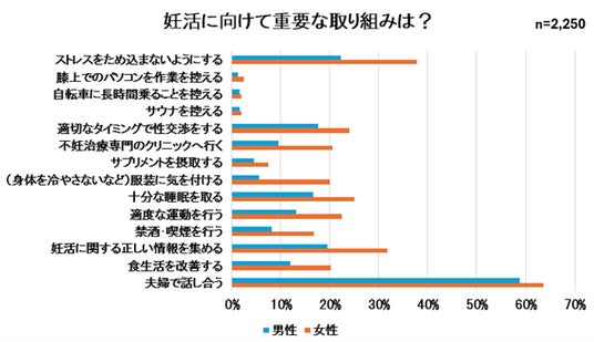 「パートナーと協力して妊活に取り組んでいたと思うか」という調査結果を見ると、一見、平等に取り組めているように見えますが、男女での妊活に対する意識に差がありました。「妊活に向けて重要だと思う取り組み」について調査をしたところ、全ての回答で男性が女性を下回る結果となりました。特に差が見られた項目は、「食生活を改善する」「妊活に関する正しい情報を集める」「禁酒・喫煙を行う」「不妊治療専門のクリニックへ行く」の4項目であり、男性は女性の約半数以下の結果となりました。