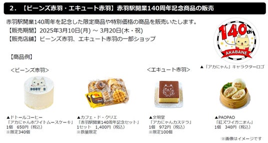 赤羽駅が2025年3月1日(土)に開業140周年を迎えたことを記念したキャンペーンで、駅員がデザインしたキャラクター「アカにゃん」のスイーツをはじめ、開業140周年を祝う限定商品や特別価格の商品等を、ビーンズ赤羽・エキュート赤羽で多数販売いたします。