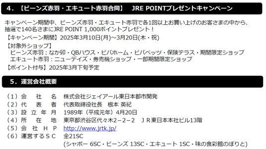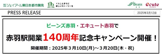株式会社ジェイアール東日本都市開発が運営する、赤羽駅直結のショッピングセンター「ビーンズ赤羽」と、赤羽駅構内のショッピングセンター「エキュート赤羽」で、2025年3月10日(月)~3月20日(木・祝)まで、赤羽駅開業140周年記念キャンペーンを開催しております。