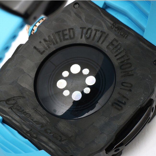鮮やかなブルーを採用したラバーストラップとリューズ、さらにバックケースには「Safari」とトッティのサインが刻印された特別モデルとなっています。