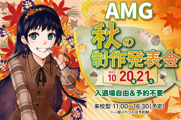エンタメ業界のプロを育成するアミューズメントメディア総合学院(東京都渋谷区、理事長:吉田 尚剛、以下AMG)が、「秋の制作発表会(入退場自由)」の開催をお知らせします。「入学相談コーナー(予約制)」や、声優学科の「朗読劇&学科説明会(予約制)」は、入学をご検討中の方向けにご予約を受付中です。