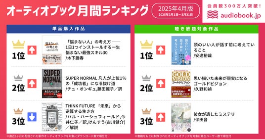株式会社オトバンク( 本社:東京都文京区、代表取締役社長:久保田裕也、以下「オトバンク」)は、当社が運営する会員数300万人超、オーディオブック書籍ラインナップ数No.1(※1)のオーディオブック配信サービス「audiobook.jp」における、オーディオブック月間ランキング4月付(2025/3/1~3/31)を発表します。