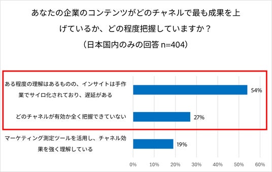 調査では、日本のマーケターが「自社のコンテンツがどのチャネルで最も成果を上げているか」について、十分に把握できていない現状も明らかになりました。調査結果によると、27%の日本のマーケターが「どのチャネルが有効か全く把握できていない」と回答(図5)。さらに、過半数を占める54%は「ある程度の理解はあるものの、インサイトは手作業でサイロ化されており、遅延がある」と認識しています(図5)。つまり、約8割の回答者がコンテンツのチャネル別のパフォーマンス把握に課題を感じていることがわかります。これは、せっかく制作したコンテンツがその真価を発揮しきれていない可能性を示しており、データの収集や分析を効率的に行い、迅速な意思決定を行うプロセスの確立は、効果的なデジタルマーケティング戦略上の喫緊の課題と言えるでしょう。