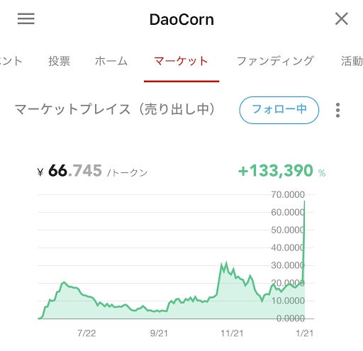 また、國光氏がプロデュースし、2024年5月にFiNANCiE上でスタートしたミーム「DaoCornトークン」は、現在約4,000名のコミュニティメンバーを擁する人気プロジェクトとなっています。トークンは0.05円からスタートし、2025年1月21日時点で66.7円まで成長を遂げています。