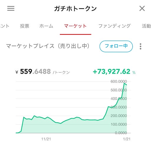 FiNANCiE内でイケハヤ氏が手掛けるミーム「ガチホトークン」は、FiNANCiE上で2024年10月にスタートしたプロジェクトで、発行から3か月で初期価格から656倍を記録しており、現在FiNANCiE内で最も価値の高いトークンへと成長しています。(2025/1/21時点)