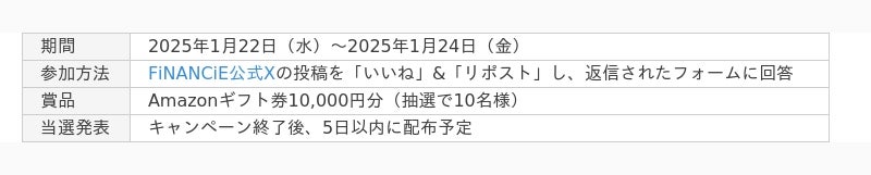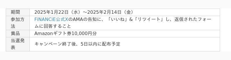 FiNANCiEの公式Xにて告知されたAMAに関連する投稿を拡散し、フォームに回答した方の中から抽選で1万円分のAmazonギフト券をプレゼントいたします。