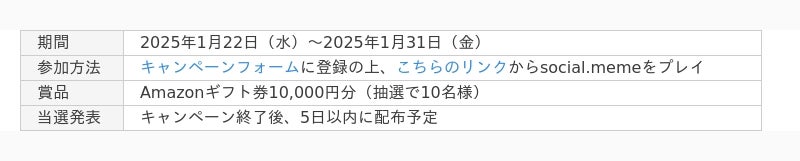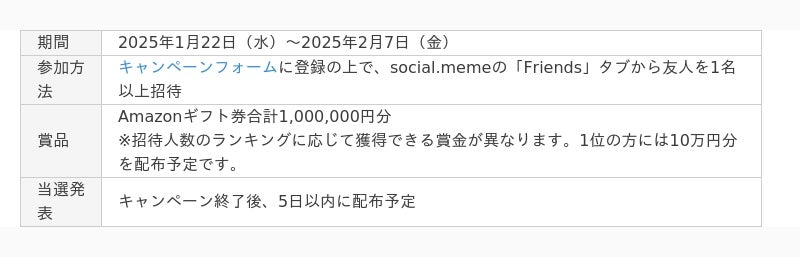 2. social.memeの体験キャンペーン(Amazonギフト券:1万円×10名様)