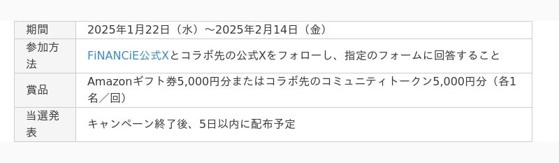 2月以降、毎日実施されるFiNANCiEオーナーとのコラボキャンペーンに参加した方に、Amazonギフト券または、コラボ先のコミュニティトークンをプレゼントいたします。