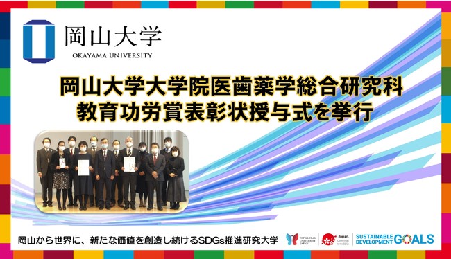 国立大学法人岡山大学(本部:岡山市北区、学長:槇野博史)の大学院医歯薬学総合研究科は、2022年1月25日、「大学院医歯薬学総合研究科教育功労賞表彰状授与式」を本学鹿田キャンパス(岡山市北区)のJホールで挙行し、団体2チームが受賞しました。