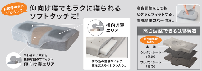 1.ソフトタッチになり、仰向け寝でもラクに寝られる仕様になりました。横向き寝エリアは頭を支えるウレタン入りで過度の沈み込みを抑制します。いびきが気になる方は横向き寝も選べ、そうでない方でも仰向け寝でもラクに寝られます。