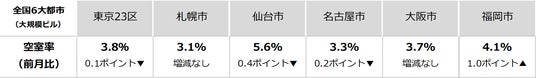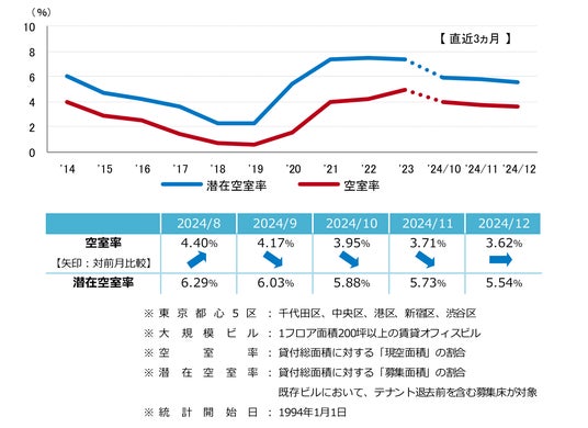三幸エステート株式会社(本社:東京都中央区、取締役社長:武井重夫)は、2024年12月度の東京都心5区(千代田区、中央区、港区、新宿区、渋谷区)および全国6大都市(東京、札幌、仙台、名古屋、大阪、福岡)の大規模ビル※1のマーケットデータをまとめた「オフィスマーケット2025年1月号」を公表します。