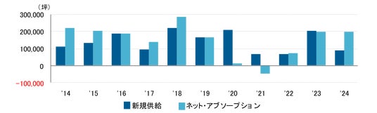 吸収需要は新規供給が多い年は伸びやすい傾向にあるが、2024年は供給が比較的低水準に止まったにもかかわらず、約20万坪の大量供給があった2023年に並ぶ強い需要を記録した。新築ビルに移転するテナントの二次空室が想定より発生していないこともあり、需要超過は2014年以来の10万坪越えで、オフィス需要には力強さが見られる。(市場調査室 今関豊和・津田宏美)