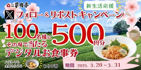 株式会社家族亭(本社・大阪府大阪市、代表取締役社長・坪山 憲司)が運営するそば和食チェーン「家族亭」は、2025年3月20日(木)午後8時~3月31日(月)の期間に、家族亭公式Xで「家族亭デジタルお食事券 500円分」が抽選で100名様に当たる家族亭公式「新生活応援Xフォロー&リポストキャンペーン」を開催いたします。家族亭の公式Xをフォローし、キャンペーンポストをリポストすることで参加ができ、当たりがその場ですぐに分かります。デジタルお食事券の抽選に惜しくも外れた方も、期間中に何度でも使える「わらび餅サービスクーポン」がもらえるとてもお得なキャンペーンです。ぜひこの機会にキャンペーンにご参加ください。