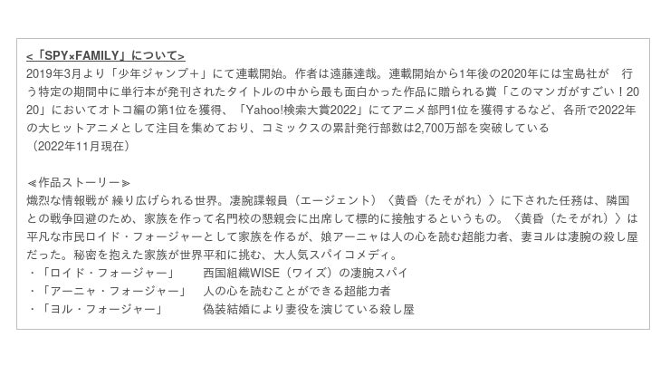 「SPY×FAMILY」は、「少年ジャンプ+」史上において最速のコミックス発行部数記録の達成※2や、「Yahoo!検索大賞2022」にてアニメ部門1位を獲得※3、今注目の大ヒット作品です。記念すべき初のコラボレーションでは、ユニバーサル・スタジオ・ジャパンの圧倒的なエンターテイメント・クオリティによって、「SPY×FAMILY」の魅力であるスタイリッシュでスリリングなアクションや、アットホームでハートフルなコメディ要素もあるストーリー、そして秀逸に作りこまれたキャラクターたちとその人間関係の中にどっぷりと浸り、物語の中に全身で入り込むことができます。