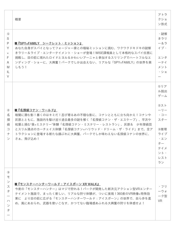 今回の特別なアトラクションは、作品史上初となる“謎解きラリー形式”のインタラクティブな没入エンターテイメントです。パーク内のあらゆる場所に隠された暗号をゲスト自身が解いていく謎解きラリーと、暗号を解読した方だけが体験できるライブ・エンターテイメント・ショーの異なる2つの超興奮体験を楽しめます。謎解きラリーでは、ゲスト自身が「WISE」の新人エージェントとして、実際にパークの中で知恵と工夫を駆使して暗号を解読する、リアルなスパイ体験をお楽しみいただけます。そして、その先には、冷静でスマートな「ロイド」と、とびきり愛らしい表情の「アーニャ」、人間離れしたアクションが魅力の「ヨル」を加えた“フォージャー家”が、みなさまの目の前に現れます。