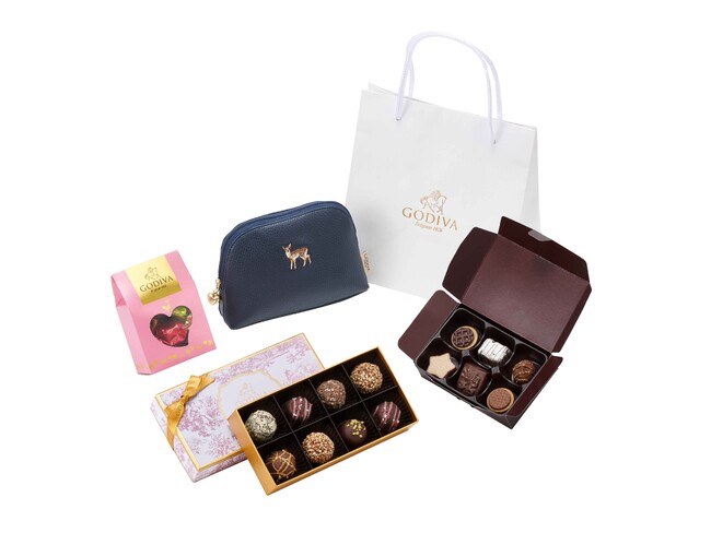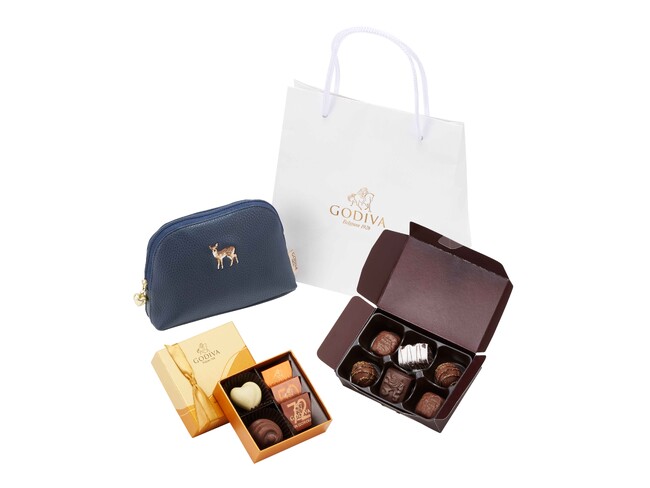 2023年のオータム コレクションのパッケージにデザインした、森の動物の中から、かわいらしい小鹿のモチーフを刺繍したオリジナルポーチをセットでお届けします。ゴディバのハートの形のチョコレート「クール」をモチーフにしたファスナーチャームや、収納ポケットが内部付いており、コスメポーチとしてはもちろん、様々なシーンで便利にご利用いただけます。
