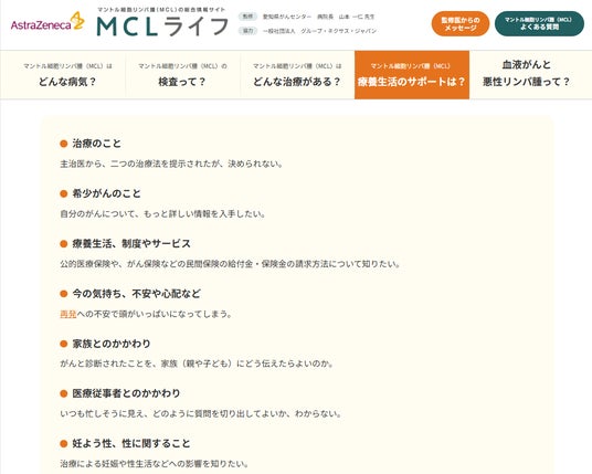 アストラゼネカ株式会社(本社:大阪市北区、代表取締役社長:堀井 貴史、以下、アストラゼネカ)は、マントル細胞リンパ腫(MCL)の患者さんやご家族に向けたMCLの総合情報サイト「MCLライフ」(https://www.az-oncology.jp/mcl-life/)をオープンしました。