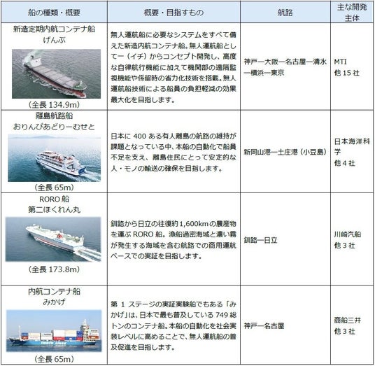 いずれの船舶も高度な自動運航システムに加え、第1ステージで課題となった船舶交通量の多い海域での航行や自動離着桟、複数船舶に対する陸上からの監視・支援等の技術を向上し、社会実装の実現を目指します。