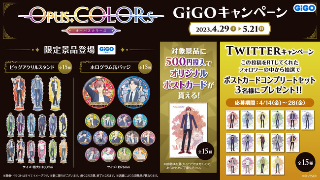 「Opus.COLORs」限定景品の入ったクレーンゲームブースにて500円ご利用されたお客様に先着で、オリジナルポストカード(全15種)をランダムで1枚進呈いたします。