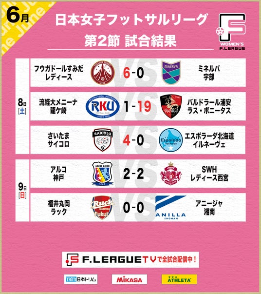 6月8日(土)・9日(日)の2日間で実施された女子Fリーグ2024-2025 第2節の5試合について結果をお知らせいたします。