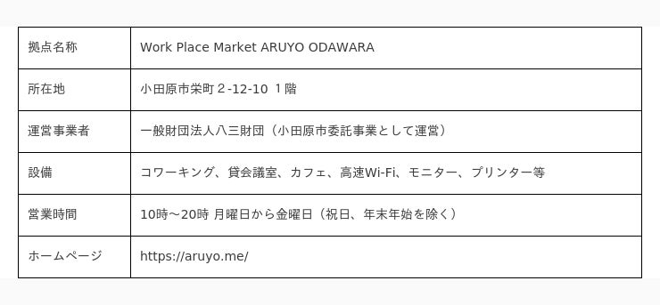 ・Work Place Market ARUYO ODAWARAにおける活動拠点(席)の無料提供