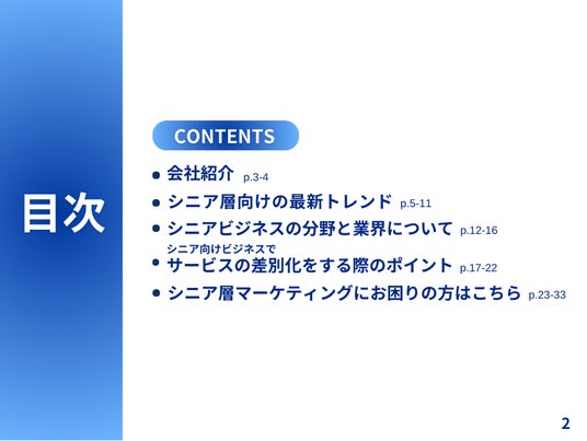 本レポートでは、シニア層のサービスの差別化をしたい方向けにマーケティングのアプローチ方法をご紹介しています。シニア層の集客にお困りの方にはおすすめの内容です。