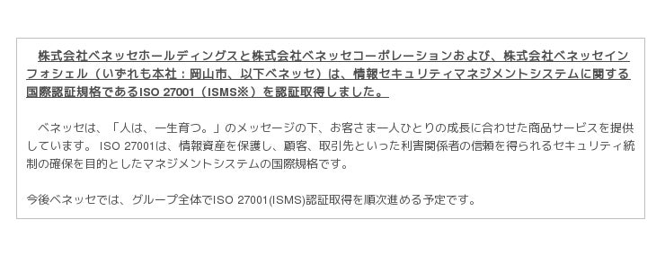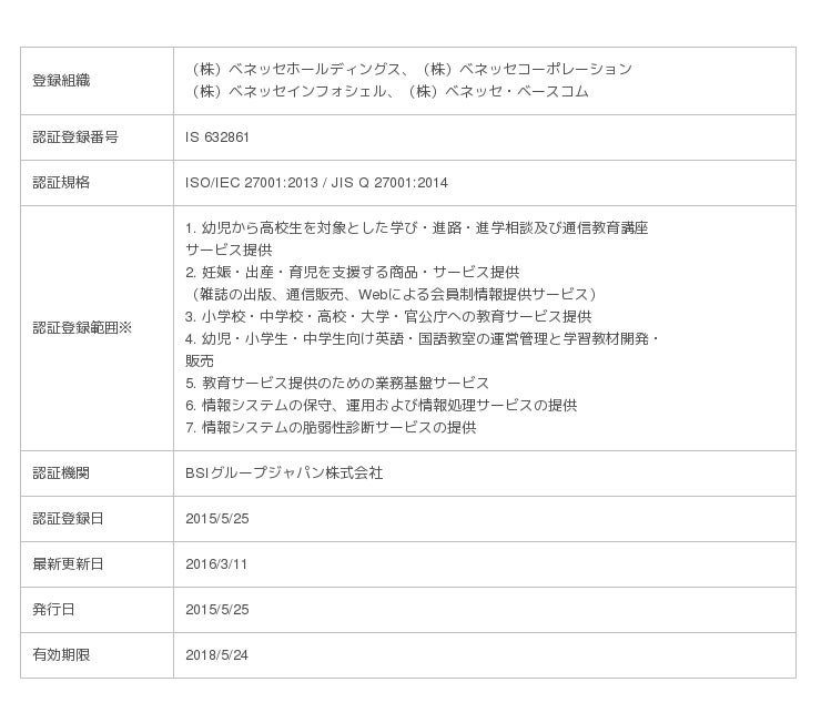 ※ベネッセホールディングス、ベネッセコーポレーションの学校本部、およびベネッセ・ベースコムは、同認証を2015年5月25日に取得済みです。