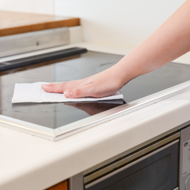 (1)シートを1枚取り出し、調理後の「コンロ周り・壁」「調理台」「シンク周り」「電子レンジや冷蔵庫の内側」「食卓」など、いつも通りにキッチン周りの拭き掃除。