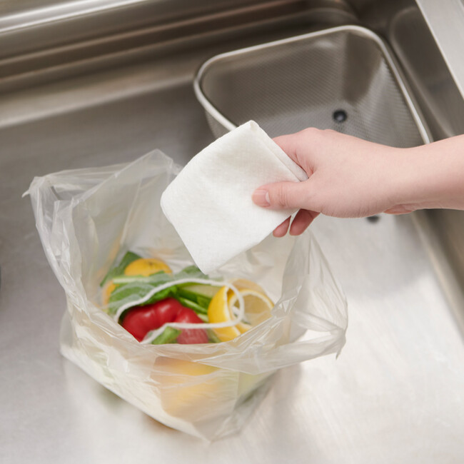 キッチン掃除後のシートを生ゴミ用ゴミ袋にポイすると、Wの消臭効果で生ゴミ臭を抑制