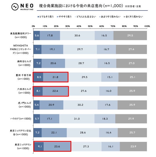 また、「六本木ヒルズ」は、来店経験・複数回来店経験ともにトップでありつつ、今後の来店意向でも上位となっています。