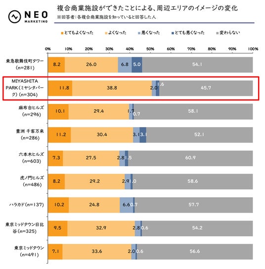 特に目立ったのが東京・渋谷にある「MIYASHITA PARK(ミヤシタパーク)」。「とてもよくなった」だけでも11.8%を占めています。