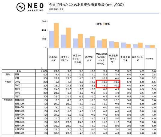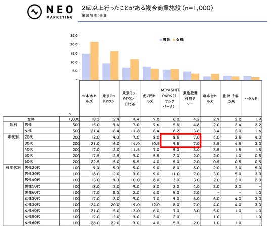 今まで行ったことのある複合商業施設(以下、「来店経験」)・2回以上行ったことがある複合商業施設(以下、「複数回来店経験」)のどちらも、男女ともに「六本木ヒルズ」「東京ミッドタウン」が上位2項目で、共通していました。
