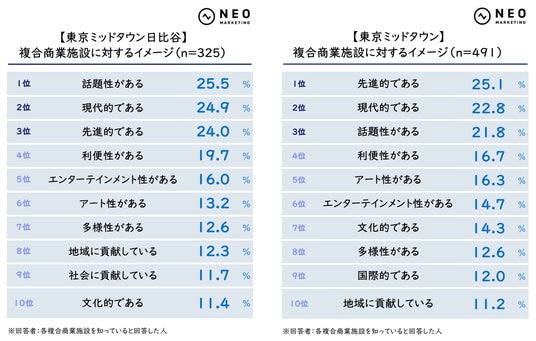 「東京ミッドタウン日比谷」と「東京ミッドタウン」は、どちらも三井不動産が手がけた施設ですが、前者の方がより「話題性がある」「現代的である」イメージが強くなっていることがわかります。