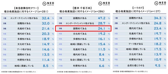 「東急歌舞伎町タワー」「豊洲 千客万来」「ハラカド」は、いずれも「話題性がある」「エンターテインメント性がある」が上位2項目を占めている点で共通していました。