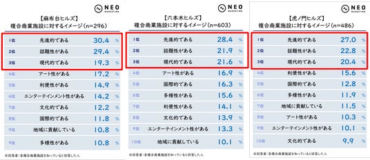 同じ森ビル株式会社が手がけた「麻布台ヒルズ」「六本木ヒルズ」「虎ノ門ヒルズ」は、いずれも共通して「先進的である」「話題性がある」「現代的である」が上位3項目を占めました。