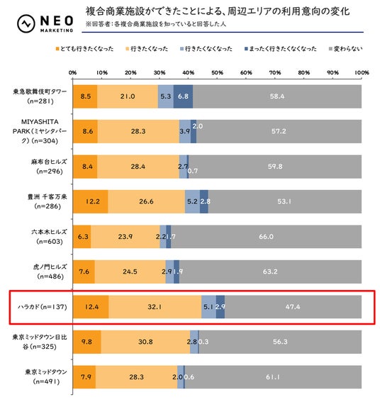 各複合商業施設を認知している人に対し(※)、その施設ができたことによる、周辺エリアの利用意向の変化をそれぞれお聞きしました。
