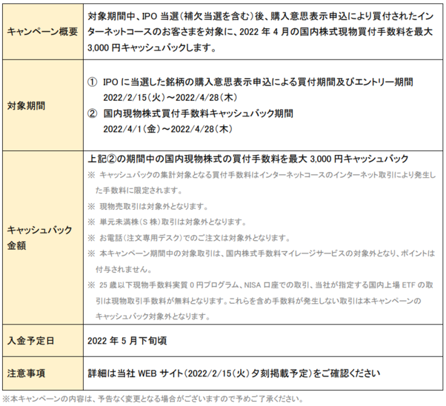 株式会社SBI証券(本社:東京都港区、代表取締役社長:高村正人、以下「当社」)は、2022年2月15日(火)から、IPO当選後の購入申込買付者全員に、現物株式買付手数料を最大3,000円キャッシュバックする「IPO投資チャレンジキャンペーン」を実施することとなりましたので、お知らせします。