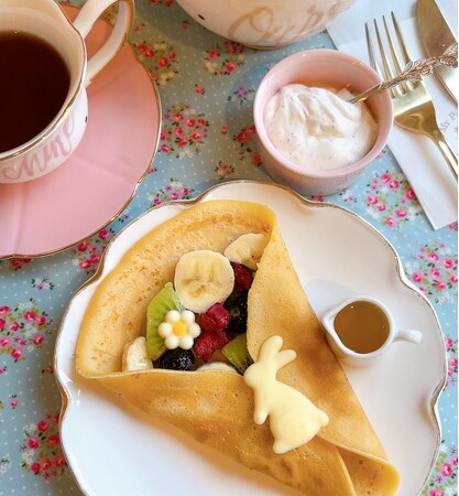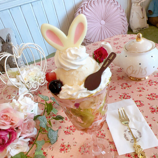 マイペリドットカフェの中でも高い人気を誇る、定番のうさ耳つきスイーツ。不思議の国のアリスの世界観をイメージし、赤いバラ(エディブルフラワー)を飾っています。ふわふわのカステラ、サクサクのグラノーラ、ホイップクリームにフルーツと、様々な食感がお楽しみいただけるメニューです。