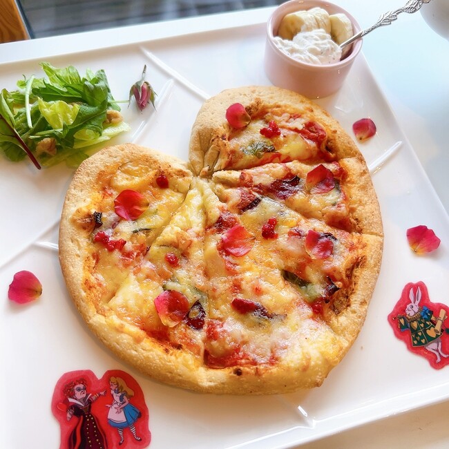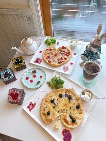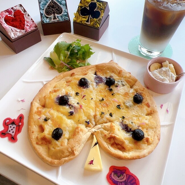 そんなマイペリドットカフェから新たに登場した、不思議の国のアリスをモチーフにしたピザやスイーツはこちら。