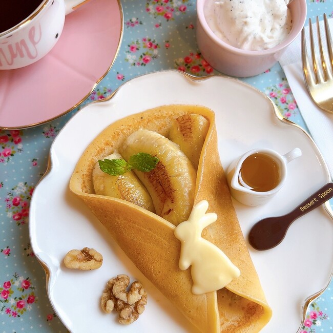 バターでソテーした焼きバナナを全粒粉入りのもちもち生地で包んだ、おいしくて可愛いクレープです。アールグレイの香りと爽やかな酸味が美味しい紅茶クリーム、ニュージーランド産クローバーはちみつ、ナッツを添えて召し上がれ。バナナやキウイ、いちごなど季節のフルーツをたっぷり使ったフルーツMIXクレープも選べます。