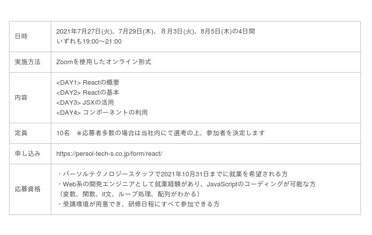 概要:約10万円相当の研修を無償で実施。4日間でReactでの開発を習得した後は、