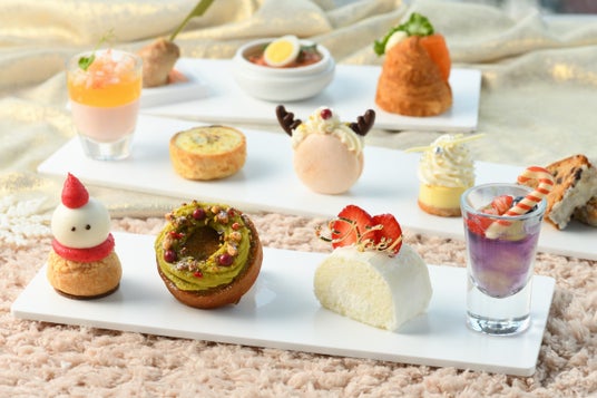 「プチシューの雪だるま」や「ピスタチオリースタルト」、「トナカイに見立てたマカロン」などクリスマスらしいラインナップが、ホリデーシーズンのわくわくを感じさせます。