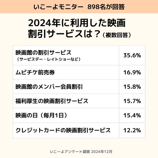 このほか、チケットがおトクに購入できる「ムビチケ前売券」や、福利厚生の映画割引サービス、クレジットカードに付帯している映画割引サービスも利用されていることがわかりました。