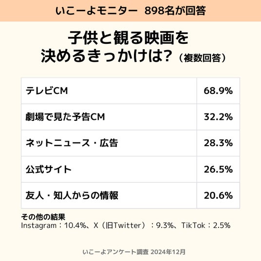「子供と観る映画を決めるきっかけ」について尋ねたところ、最も多かったのは「テレビCM」でした。「劇場CM」や「ネット記事・広告」の影響も高く、約3割を占めています。