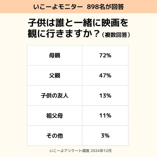 また、「子供は誰と映画を観に行きますか?」と尋ねたところ、「ママ」と一緒に行く割合が最も高く、72%に達しました。