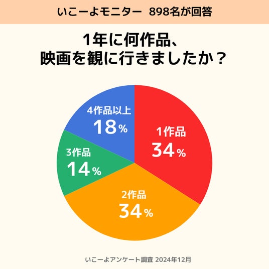 はじめに「1年に何作品、映画を観に行きましたか?」という質問をしたところ、2作品以上観ると答えた人が大多数を占めており、1年間で平均2.4作品の映画を楽しんでいることがわかりました。
